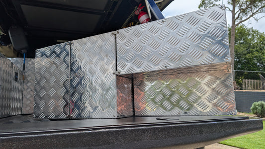 design) before moving to wooden tests, to actual prototypes with extrusion and checkerplate, the first designs of STORMOD were born. This 'final' prototype setup was 2x Square Storage Bin boxes and 1x Over-Arch Box. I ran this setup for over 12 months and tested the heck out it, many trips with gear thrashing around inside, full lithium 12v setups, even a fully loaded 8000 km Cape York trip.